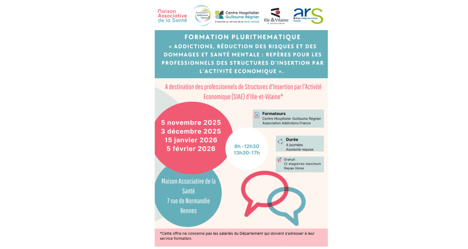 La Maison Associative de la Santé, en partenariat avec le Centre Hospitalier Guillaume Régnier (CHGR), l’Association Addictions France et le Département d’Ille-et-Vilaine, et avec le soutien financier de l’ARS Bretagne, propose une formation pluri-thématique à destination des professionnels des Structures d’Insertion par l’Activité Économique (SIAE).