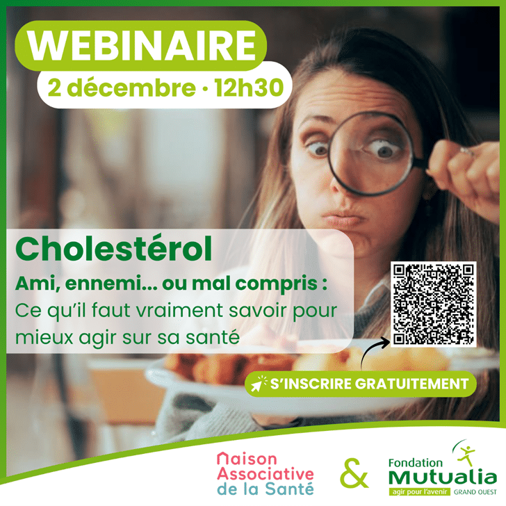 💻📱 Mardi 2 décembre 𝗮̀ 𝟭𝟮𝗵𝟯𝟬, avec la Maison Associative de la Santé de Rennes et la Fondation Mutualia Grand Ouest, nous vous invitons à un webinaire dédié pour comprendre cholestérol, identifier les bons réflexes du quotidien et adopter une approche équilibrée de la prévention cardiovasculaire.